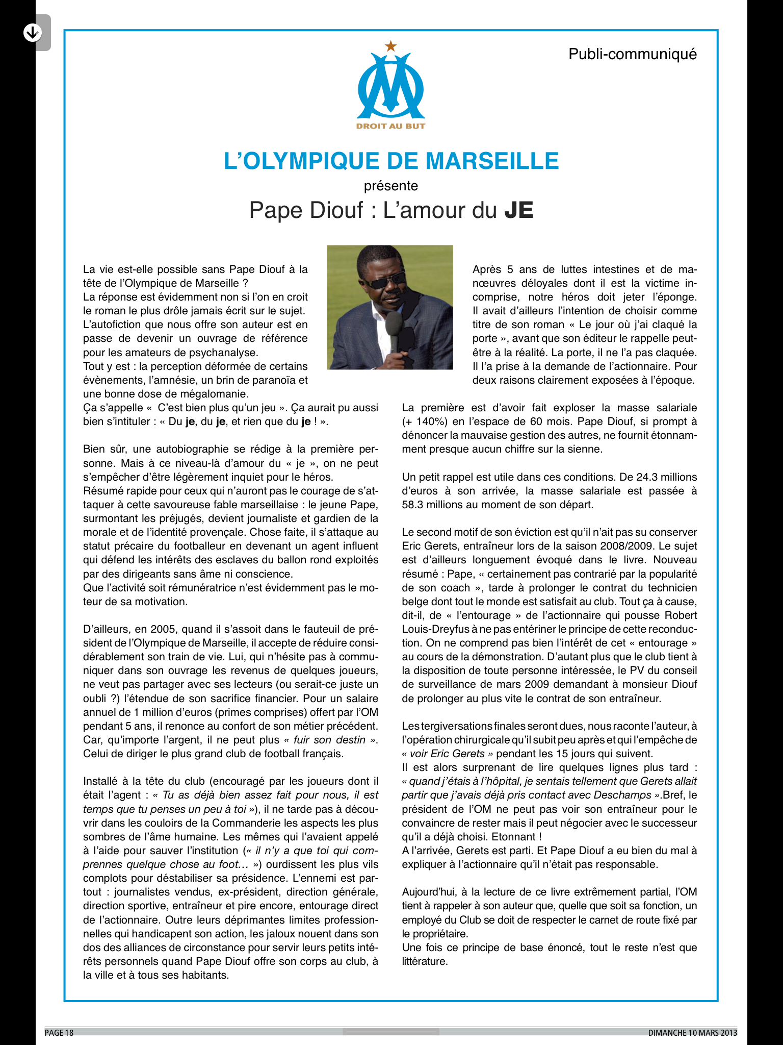 C'est insupportable, et l'OM a décidé de... se payer une page de publicité dans l'Equipe pour répondre à Diouf. La réponse est cinglante : en parlant du livre "tout y est, la perception déformée de certains évènements, l'amnésie, un brin de paranoïa et une bonne dose de mégalomanie". Le club a l'élégance de révéler le salaire de Diouf à l'époque où il était président (80 000 euros mensuels, combien pour Labrune ? Mystère...).